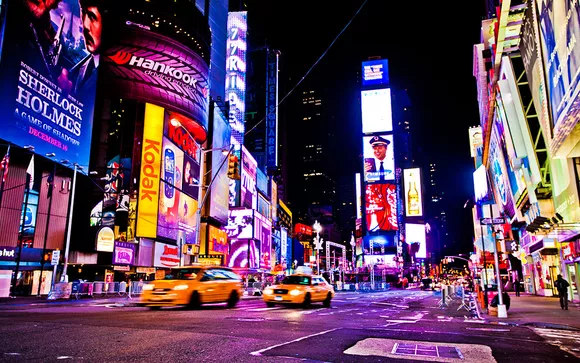 Sus rascacielos iluminados dominan el paisaje nocturno.